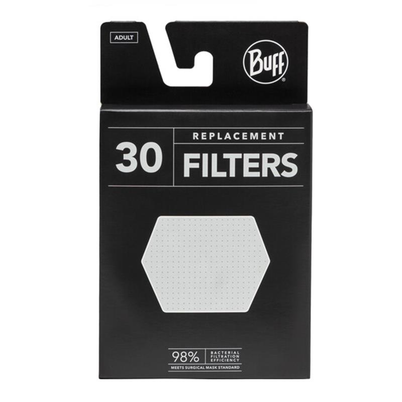 Filter Pack BUFF® – 30 kosov – odrasli. Paket nadomestnih filtrov, zasnovan za filtrirno masko BUFF®. Zelo zračen, da vam zagotavlja udobje pri vsakodnevnih aktivnostih. Troslojna konstrukcija, 98% učinkovitost bakterijske filtracije in vodoodbojne lastnosti. Filtri za enkratno uporabo, priporočena uporaba največ 24 ur. Popolnoma brez veziva, brez lateksa, brez lepila, brez steklenih vlaken.